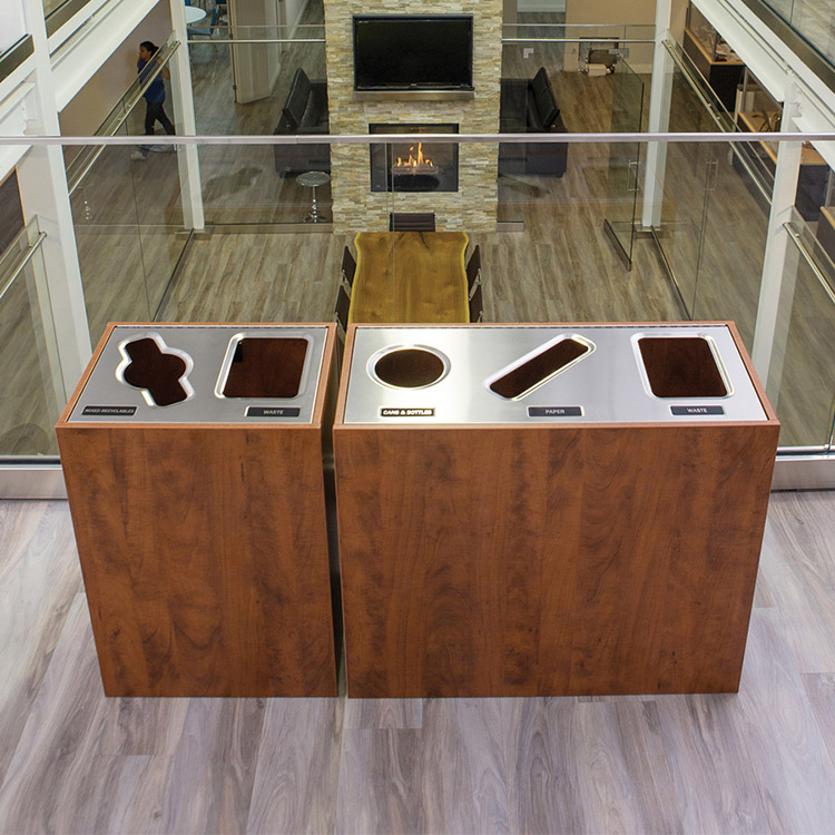 Our in-house design team can customize your recycling bins to promote your brand and program, and to match any décor.