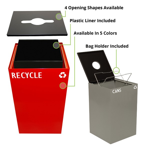 Our in-house design team can customize your recycling bins to promote your brand and program, and to match any décor.