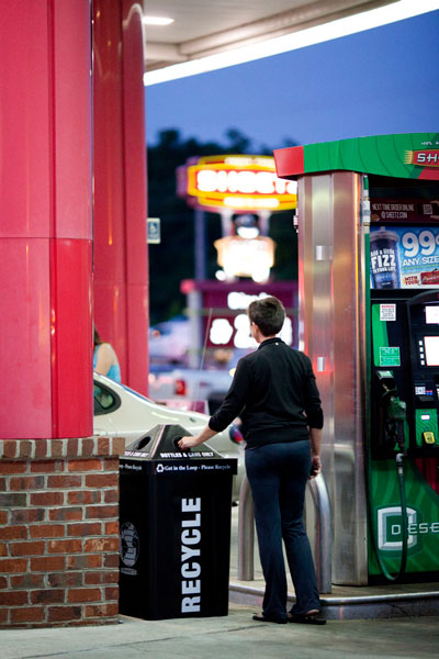 Details MatterBut a convenience store/gas station is a lot different than a corporate lobby or a college cafeteria. Lots of traffic, by definition. A customer base that isn't expecting to see a recycling container. Space issues. Wind--gas stations have lots of wide-open space, and the mid-Atlantic sees its share of windstorms. And then there's aesthetics. Sheetz has its own look, its own signature color (red) and a reputation for being a place to get good food on the road. It was important to come up with something that didn't clash with any of that.